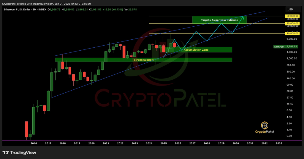 Crypto Patel’s long-term Ethereum chart frames the present market construction as constructive reasonably than bearish. Based on his evaluation, the $1,800 to $2,900 vary represents a long-term accumulation zone, the place affected person positioning tends to outperform reactive buying and selling. On the chart, Ethereum stays inside a rising macro channel that has guided value motion for practically a decade.