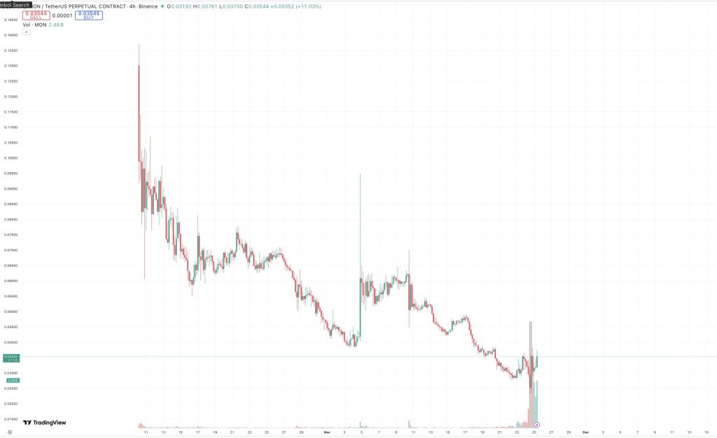 MON’s first buying and selling day didn’t ship the “wow” impact many anticipated. Hopes that Coinbase would function an off-the-cuff assure towards a weak token sale look fragile for now. MON noticed a short pump to $0.035, which allowed some merchants to take a small revenue, however the transfer didn’t final.